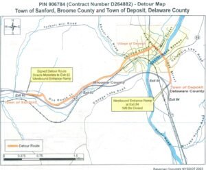 Detour during construction season 2024: Exit 84 on ramp towards Binghamton will be closed, Traffic to enter 17 West at exit 83.
